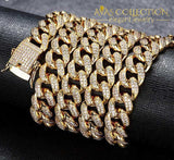 Cuban Chain Iced Out CZ Cuban Link is 24k Gold Filled with Simulated Diamonds. This Chain is high quality and available in two tones and in several lengths.